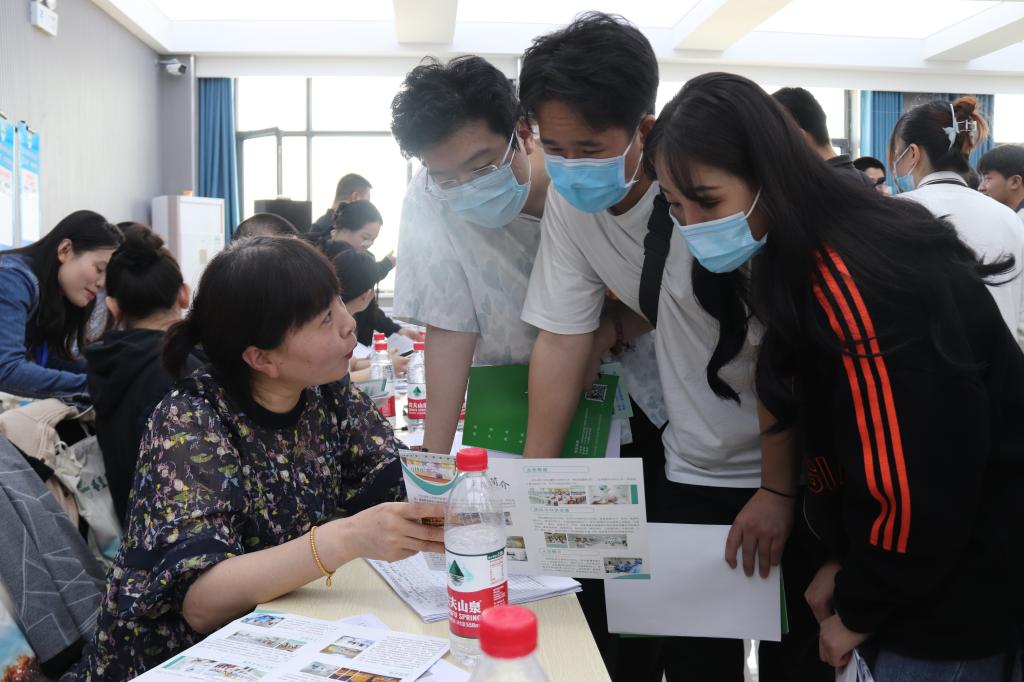 招聘会现场,院领导对用人单位来校招聘表示欢迎和感谢,详细询问用人单位的人才需求情况和招聘情况。