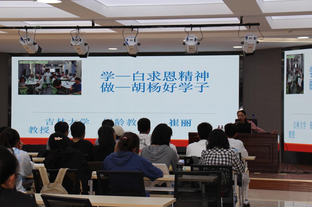 9月26日,吉林大学银龄教师崔丽教授在医科楼五楼报告厅给全体新生作《学—白求恩精神,做—胡杨好学子》专题讲座,全体辅导员参加。