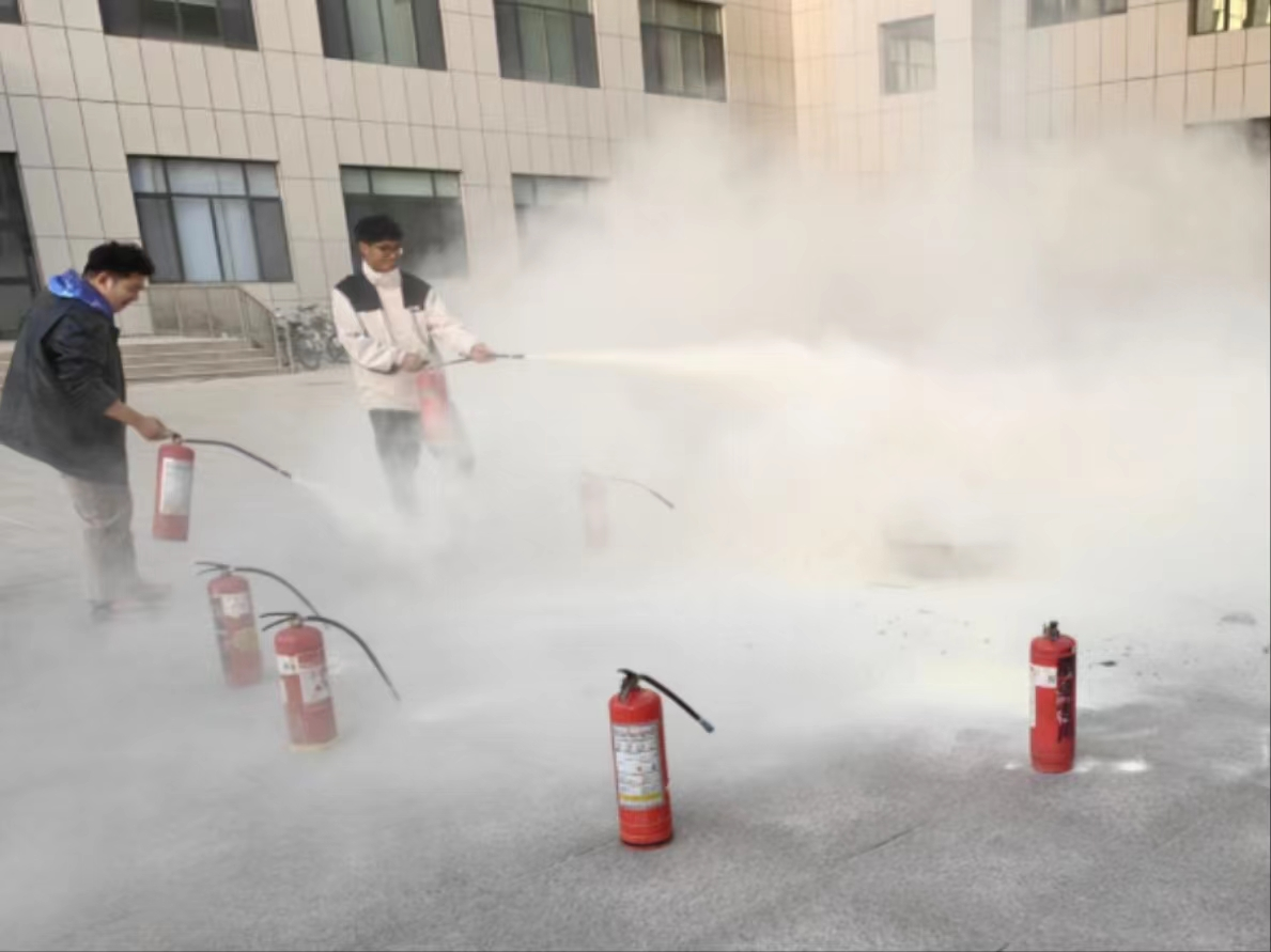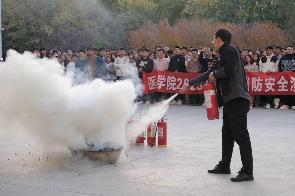 学院邀请保卫部专业人员,为全体师生普及消防知识,并进行有奖问答活动和灭火器实操。