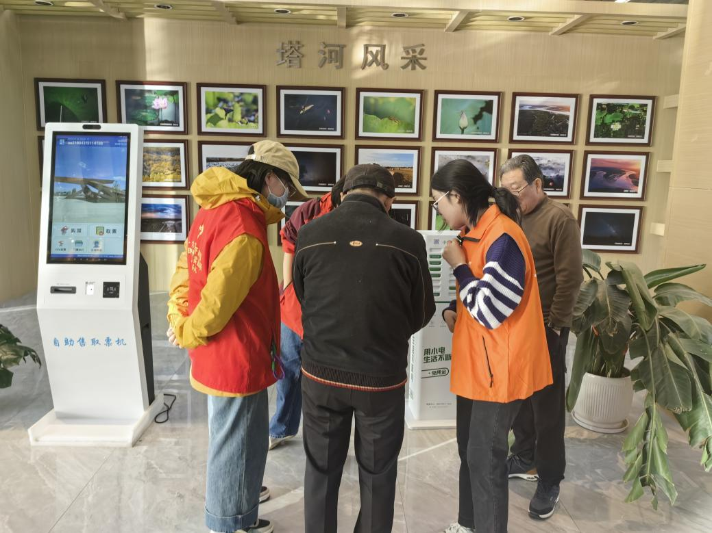 志愿者们身着统一的“志愿红”和”胡杨橙“,活跃在景区的各个角落。他们积极投身于景点咨询、分发宣传资料等多个岗位,并向旅客介绍塔河的历史文化和特色产品。