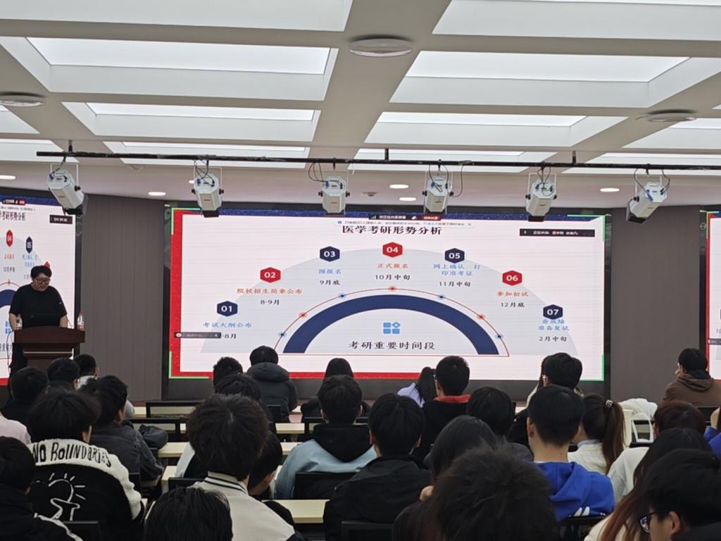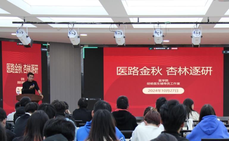 10月27日晚,“医路金秋,杏林逐研”考研交流分享会在医科楼五楼报告厅举行。本次分享会特邀周桐舟同学为嘉宾,分享会由学生工作办公室武逸凡主持,共144人参会,其中线下120人,线上24人。