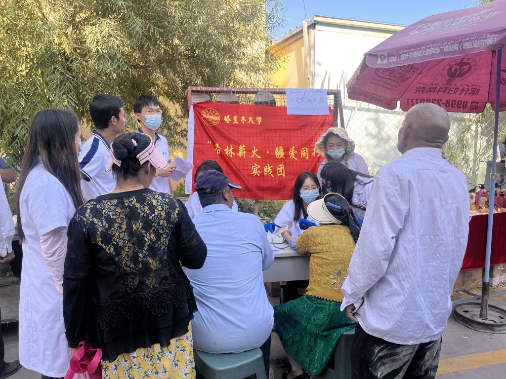 下午,实践团在巴合齐乡农贸市场门口设立“义诊小摊”,为过往村民提供免费血压检测服务,并耐心细致地向村民科普健康知识。在义诊过程中,团队成员还与村民深入交流,详细了解当地就医情况。
