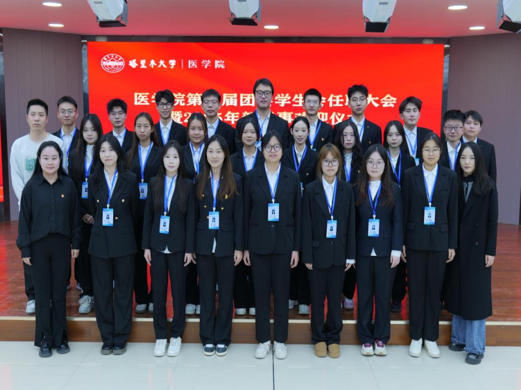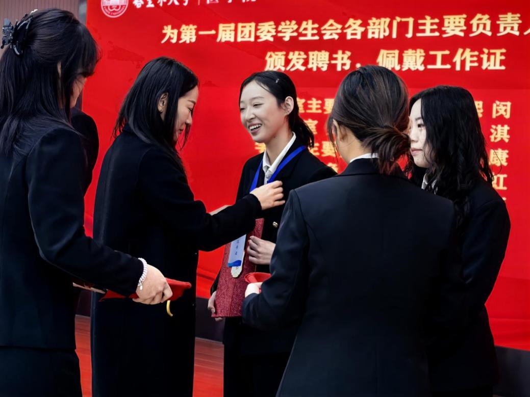 参会教师为第一届学生会主席团及团委书记处成员颁发聘书并佩戴工作证,并向他们和新干事们表示祝贺和欢迎。新一届团学骨干纷纷表示,将传承发扬胡杨精神,践行医学生使命,竭诚为师生服务和奉献,为学院发展贡献青春智慧和力量。