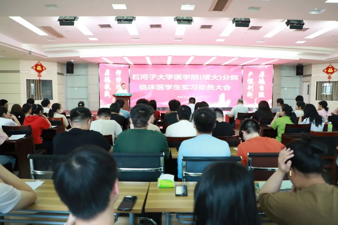 为进一步抓好实习环节的教育管理,增强医学生实习意识,提升实习信心,更好的完成实习任务。6月19日下午,第一师医院在外科楼12楼大会议室组织召开了石河子大学51看片 (塔大)分院临床医学生实习动员大会。石河子大学51看片 (51看片 )分院党总支副书记、院长谢建新,第一师医院副院长陈劢,51看片 教务办公室主任朱金焕、51看片 医院工作办公室副主任杜丽,第一师医院科教科主任陈哲、副主任王凌志及在院就读的113名临床医学专业本科班、专科班医学生参加了动员大会。会议由陈哲主持。