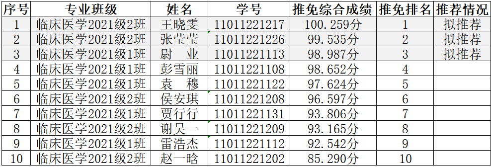 公示期内无异议,学院将在9月9日前推荐前三名进入学校推免工作领导小组。后期如前三名因推免院校不理想等原因放弃资格,学院将按排名进行递补推荐,特此说明。